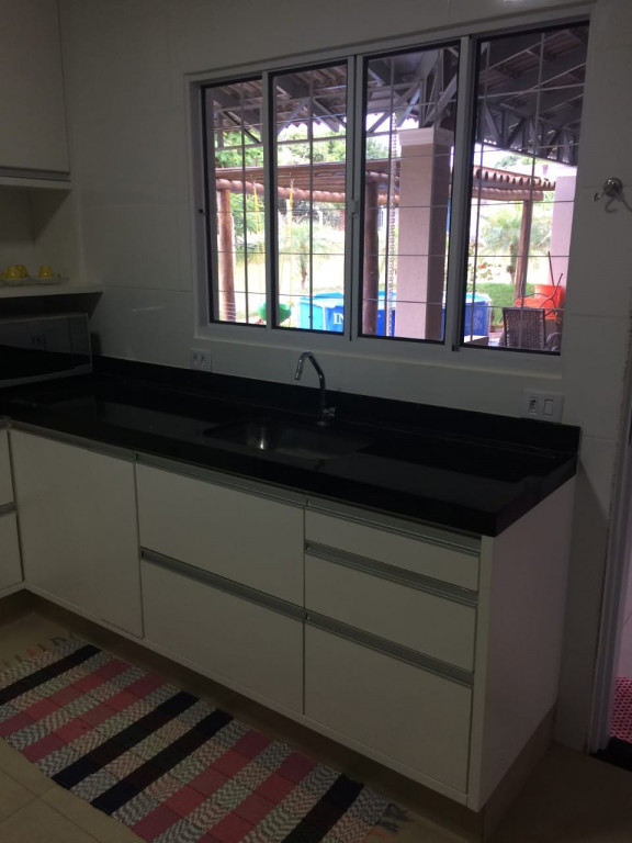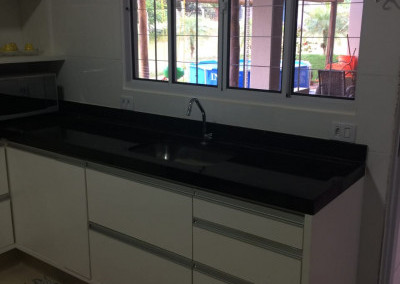 Cozinha com pia toda em granito e fogão Cooktop.